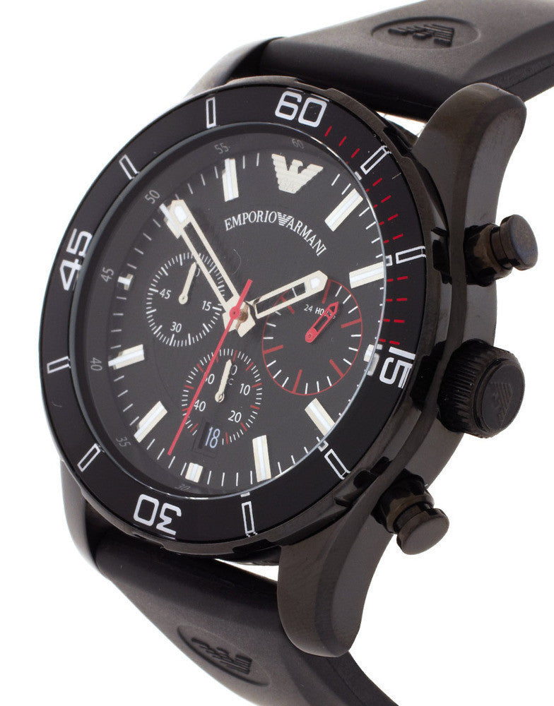 Rubber watch by Emporio Armani. Featuring a logo embossed round dial with contrast indices, chronograph sub dials and a three hand analogue movement, a smooth bezel, three raised crowns, a stainless steel backing, an embossed rubber strap with a pin buckle fastening and a keeper, includes a branded presentation box.